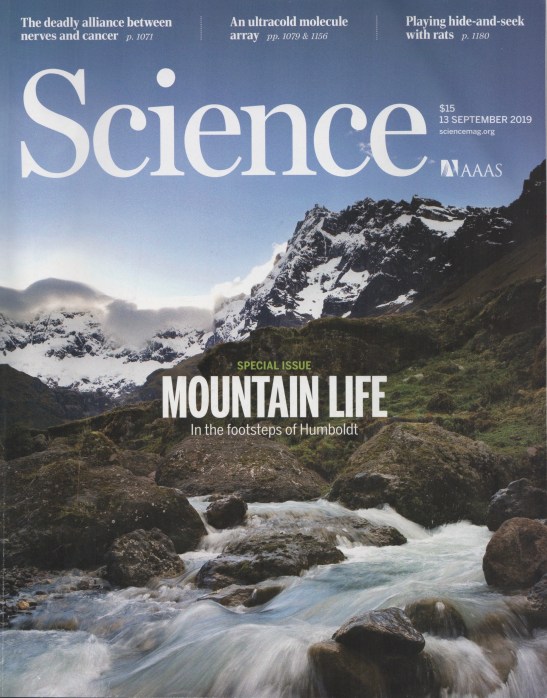 Like others of its Special Issue focuses, “Mountain Life” is multidimensional and multidisciplinary. Features include the issue’s Editorial “A Humboldtian View of Mountains,” celebrating 19th-century naturalist Alexander von Humboldt’s ecological theories; “Humboldt for the Anthropocene,” on his fusion of science and humanism; “Fire on the Mountain,” discussing the effects of climate change at the Earth’s peaks; “Sunken Summits,” on whether deep-sea mining and conservation can coexist; “Humboldt’s Enigma,” addressing global patterns of mountain diversity; and “Hypoxia City,” on one of the most harsh of human settlements.