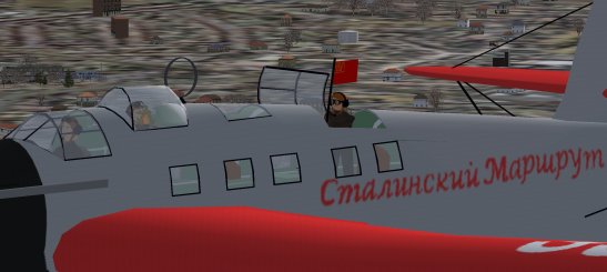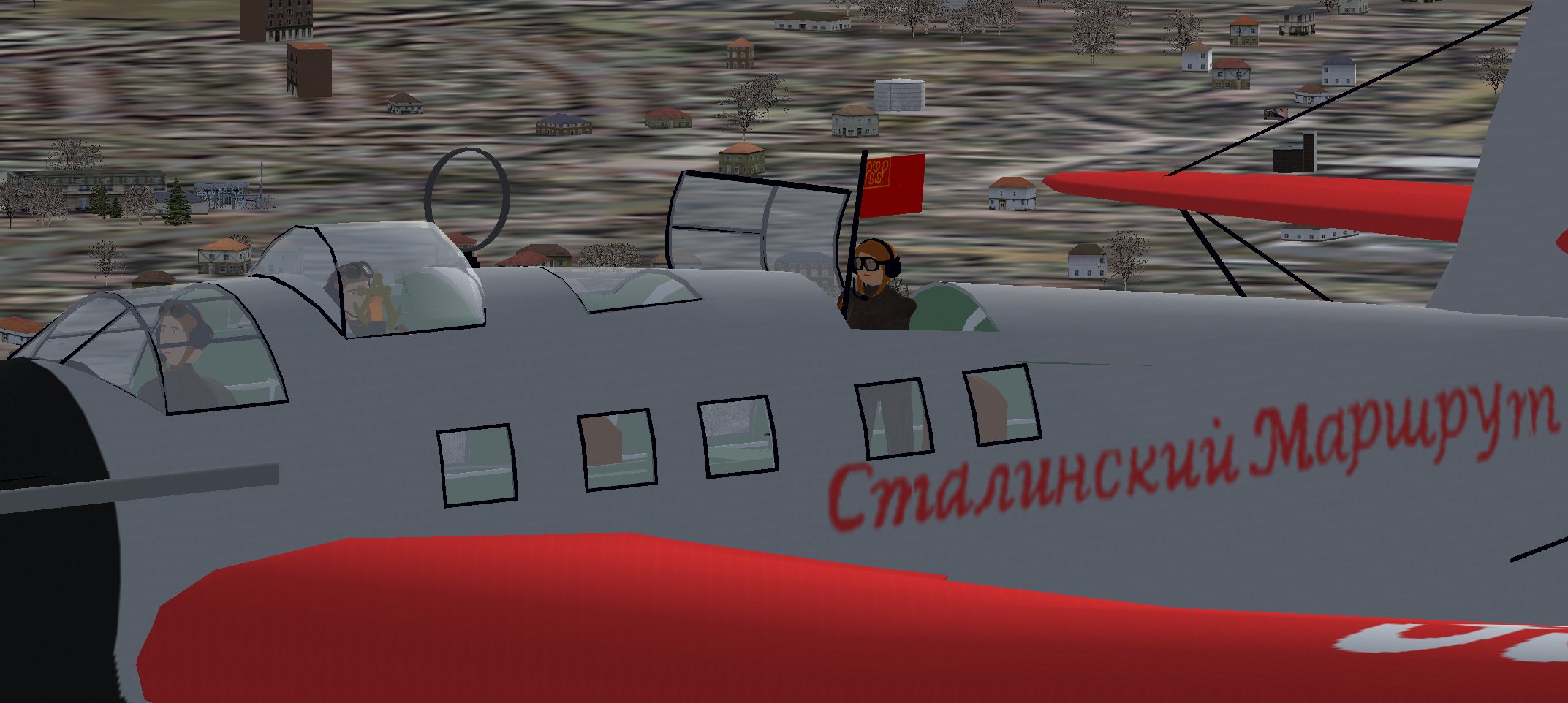 I had fun with the copilot’s idle time by giving him a Soviet-era flag to wave. What with 1937 being the year of the ANT-25 Moscow/U.S. flights, I chose a flag of the Russian Soviet Federative Socialist Republic, 1918-1937.