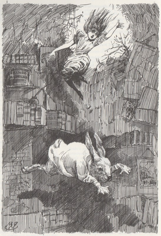 Rabbit Hole Physics. Falling down the rabbit hole, Alice grasps a jar of marmalade from a shelf, one of many furnishings lining the hole. Not wanting to drop it, she chooses to place the jar in a cupboard farther down.