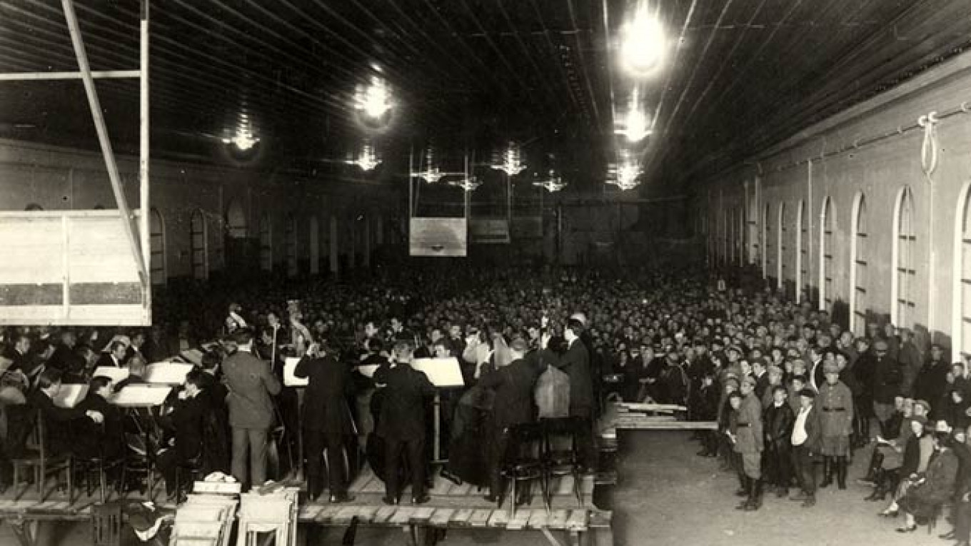 Pervy Simfonichesky Ansambl Bez Dirizhyora, a Conductorless Symphonic Ensemble, or Persimfans, was named an Honored Collective by the Soviet government in the 1920s. Image from The Moscow Times, April 29, 2014.