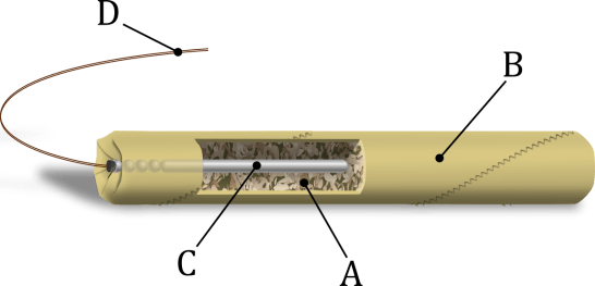 Dynamite. A: absorbent material soaked in nitroglycerin. B: protective casing. C: blasting cap. D: Fuse. Image by Pbroks13.