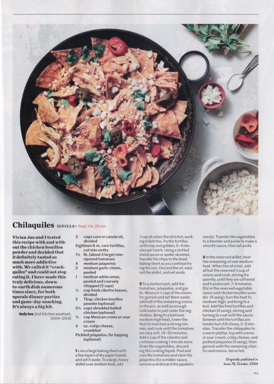 We ordinarily do it vegetarian and prefer the veggies unblenderized. Judy Joo, Saveur test kitchen assistant, 2004–2006, says, “Vivian Jao and I tested this recipe with and without the chicken bouillon power and decided that it definitely tasted so much more addictive with. We called it crack-quiles.’ ” I must try it with the powder.