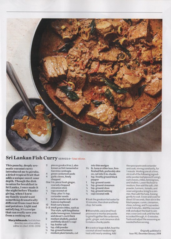 Sri Lankan Fish Curry. This one, originally published in Issue 192, December/January 2018, is new to our kitchen. Stacy Adimando, test kitchen director, executive editor, editor-in-chief, 2016–2019, writes, “This punchy, deeply aromatic coconut curry introduced me to goraka, a dried tropical fruit that adds an unique sweet-sour depth.” Me too about goraka.