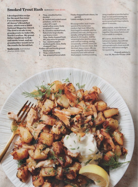 Smoked Trout Hash. Originally published in Issue 114, November/October 2008, this one amplifies on our family’s proclivity for potatoes. My version used Trader Joe’s smoked trout and may occasionally overdo the garlic.