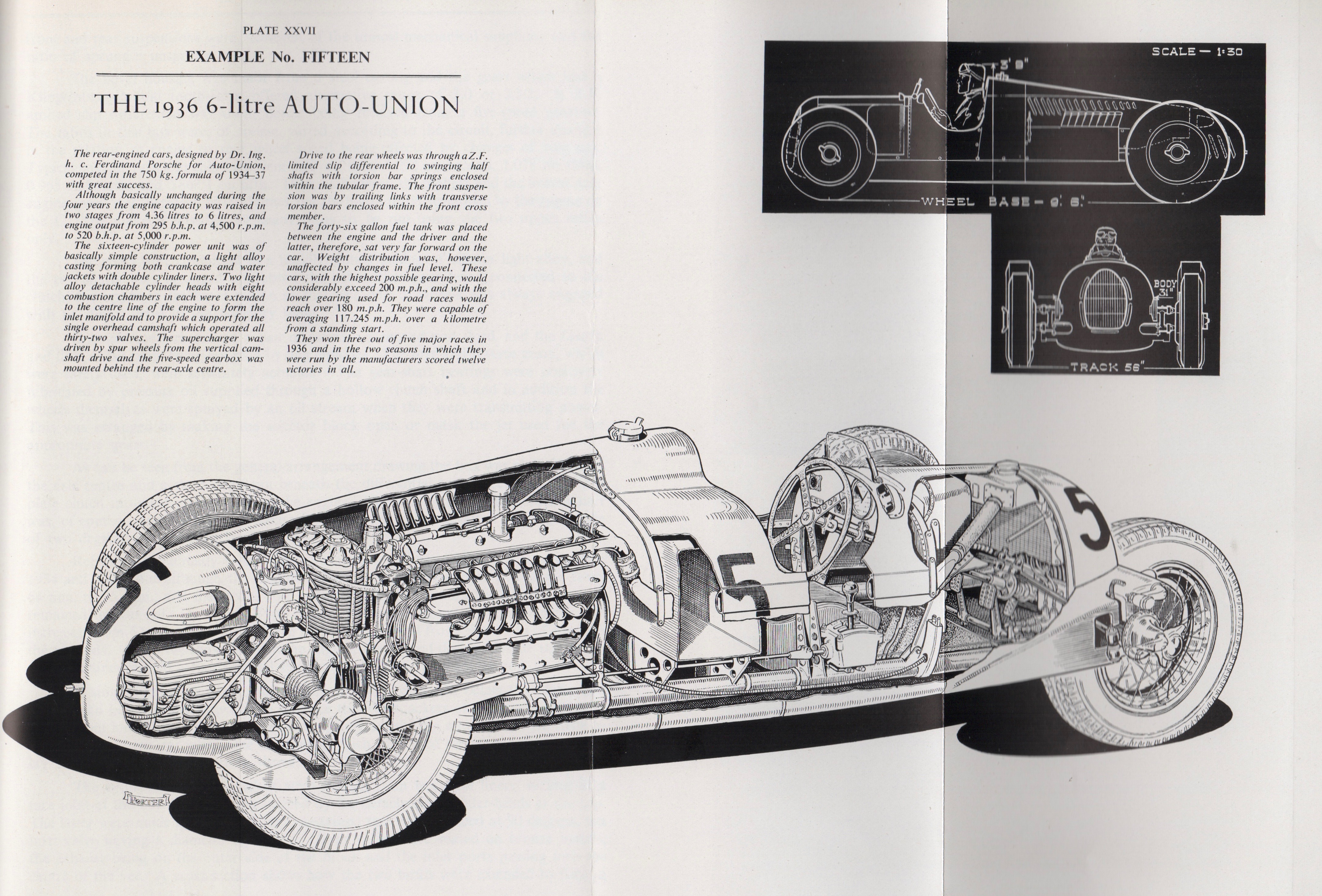 THERE WAS A TIME when Grand Prix cars had front engines. Ah, but the exception was exceptional indeed: the Auto Union. What’s more, these cars were documented by two giants of automotive journalism, Laurence Pomeroy and Karl Ludvigsen. Here are tidbits about the 1936–1937 Auto Union Type C gleaned from Pomeroy’s The Grand Prix Car, Volumes 1 and 2, 1955, and Ludvigsen’s “Auto Union Grand Prix Car,” in Automobile Quarterly; Volume VIII, Number 1, Summer 1969.