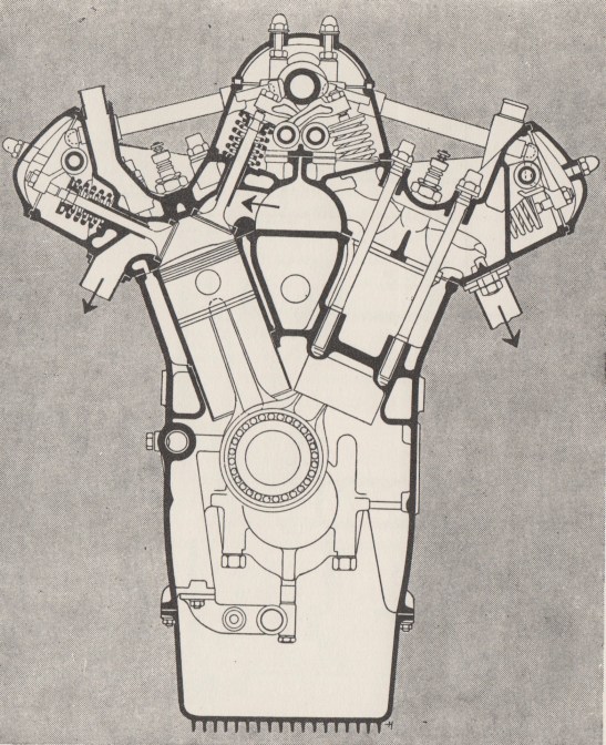 Cross section of the Auto Union 16-cylinder engine. Notice the lateral pushrods activating the exhaust valves from a single centrally located camshaft.