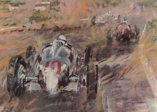 “May 10, 1936. The C-Type in a driving sandstorm during the Tripoli GP at Mellaha. In addition to battling the Alfas and Mercedes, Auto Union fought among themselves during this one. It was Achille Varzi and Hans Stuck who had the disagreement—and Varzi won out….” This and the following Gotschke illustrations are from Automobile Quarterly, Summer 1969.