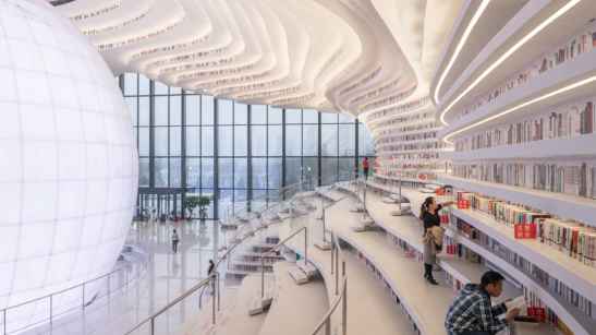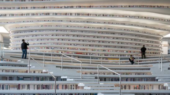 The Tianjin Binhai Library. Tianjin is on the Chinese coast, about 100 miles southeast of Beijing. Its Tianjin Binhai Library was commissioned by the Tianjin Urban Planning and Design Institute and designed by Rotterdam-based MVRDV.