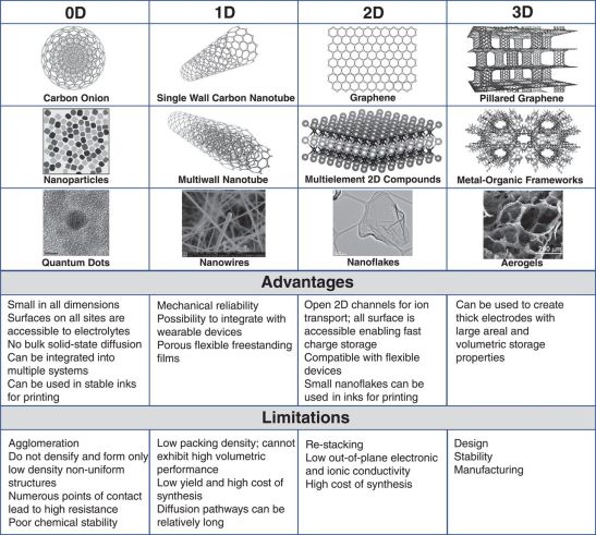 Enhancements. Researchers note that nanomaterial electrodes will perform at least an order of magnitude better than conventional ones. Nanostructured materials and nanoarchitectural electrodes can lead to “high-energy, high-power, and long-lasting energy storage devices.”