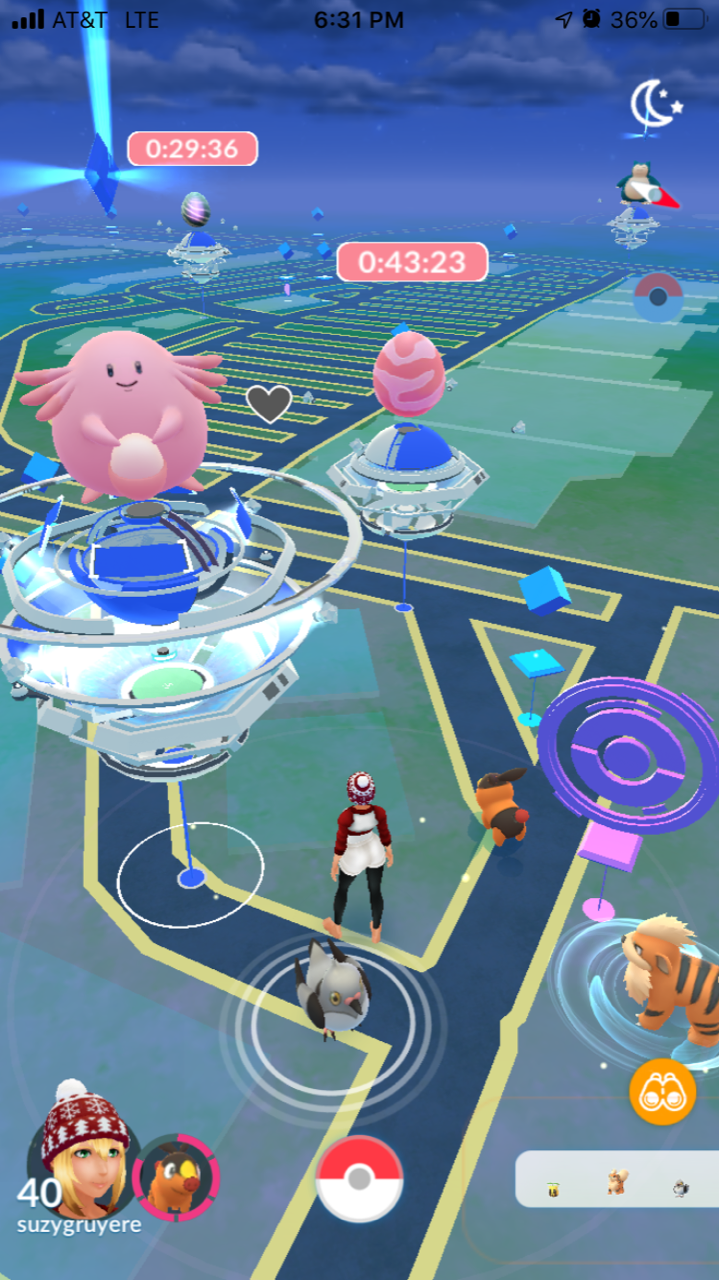 Daughter Suz explains that she accumulates Pokéballs at Pokéstops, uses the Pokéballs to capture Pokémon characters, and that Pokégyms are where players gather to battle especially powerful Pokémon and earn rewards.