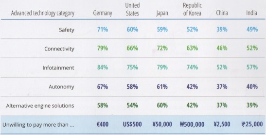How Much Are Consumers Prepared to Pay? Deloitte observes that consumers in the more mature automotive markets “have been trained for many years to expect manufacturers to introduce advanced technologies at little or no additional cost as a way to differentiate themselves in the market.”