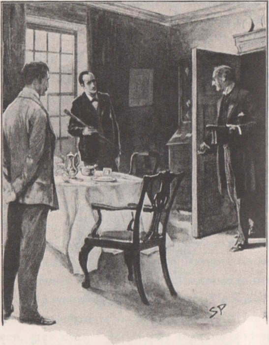 James Mortimer, right, meets Holmes and Watson. Image by Sidney Paget from The Strand Magazine, 1901.