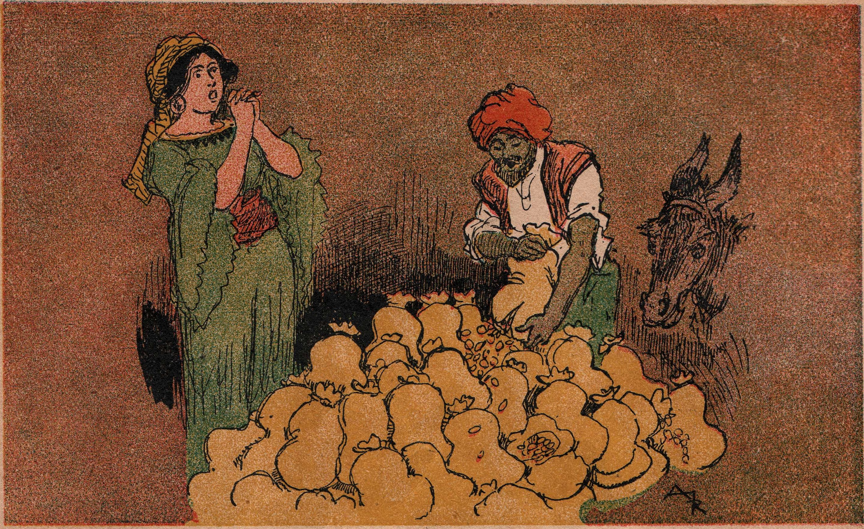 Ali Baba presents Morgiana with treasures from the magical cave of Sesame. Illustration by Albert Robida.