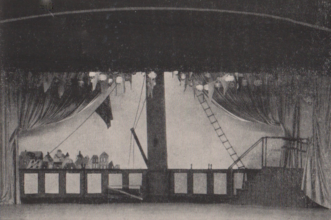 H.M.S. Pinafore, 1878, by William S. Gilbert and Sir Arthur Sullivan. University of Montana. “This photograph,” said Stratton, “illustrates what can be done with a gray cyclorama, a few pieces of scenery, and a plaster back wall. The cost of the setting was fourteen dollars.” This and the following image from Theatron.