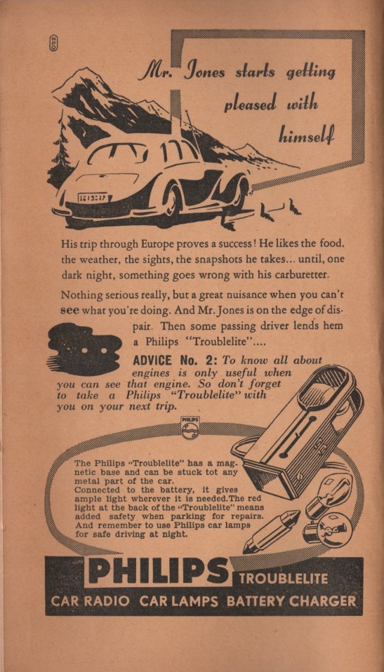 Philips and Mr. Jones. Opposite the title page of Motoring Through Europe, we learn that “Mr. Jones starts for a trip through Europe.” Alas, he “thinks he cannot possibly have forgotten anything,” only to discover a dead battery (the guide calls it an “empty” one).