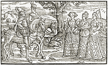 Above, in Holinshed’s Chronicles, 1577, the witches appear as well-bred gentlewomen. Below, Théodore Chassériaau’s 19th-century rendering of the scene gets more to the point.