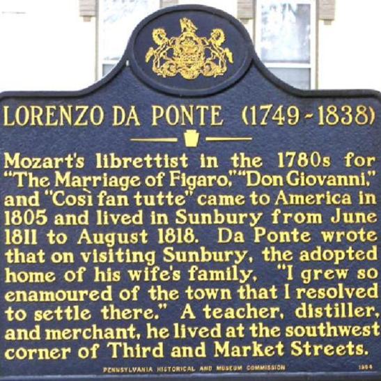There, Da Ponte first lived in New York City; then tried his hand at a distilling operation, the grocery business, and teaching Italian in Sunbury, Pennsylvania; then back to NYC where he ran a bookstore; then as the first professor of Italian literature (unpaid) at Columbia College. Wikipedia notes, “He was the first Roman Catholic priest to be appointed to the faculty, and he was also the first to have been raised a Jew.”