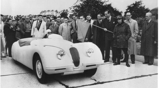 The Jaguar XK-120, chassis 670002, at Jabbeke Highway, May 30, 1949. Image from stevemckelvie.wordpress.com.