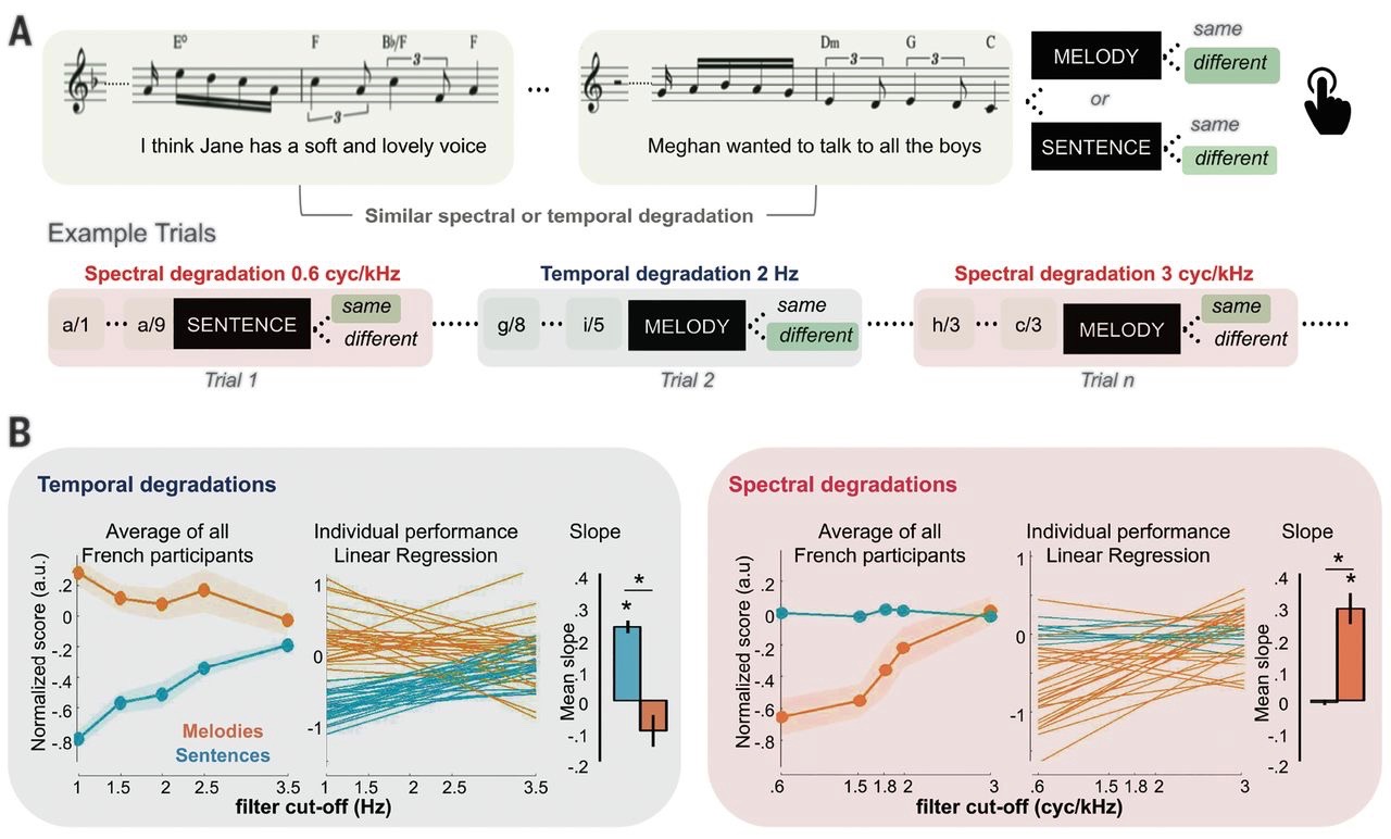 Sammler notes, “… the authors established that the stepwise removal of temporal detail impairs recognition of the words (but not recognition of the melodies), whereas the degradation of spectral detail weakens recogniton of the melodies (but not recognition of the words).”