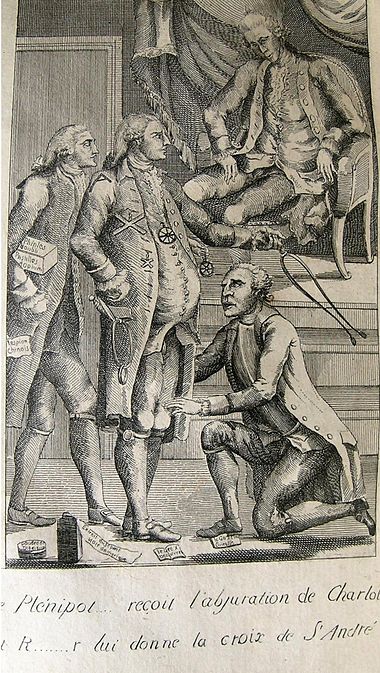 Charles Théveneau de Morande, on his knee, receives the Croix de Saint-André. Image from wikiwand.com.