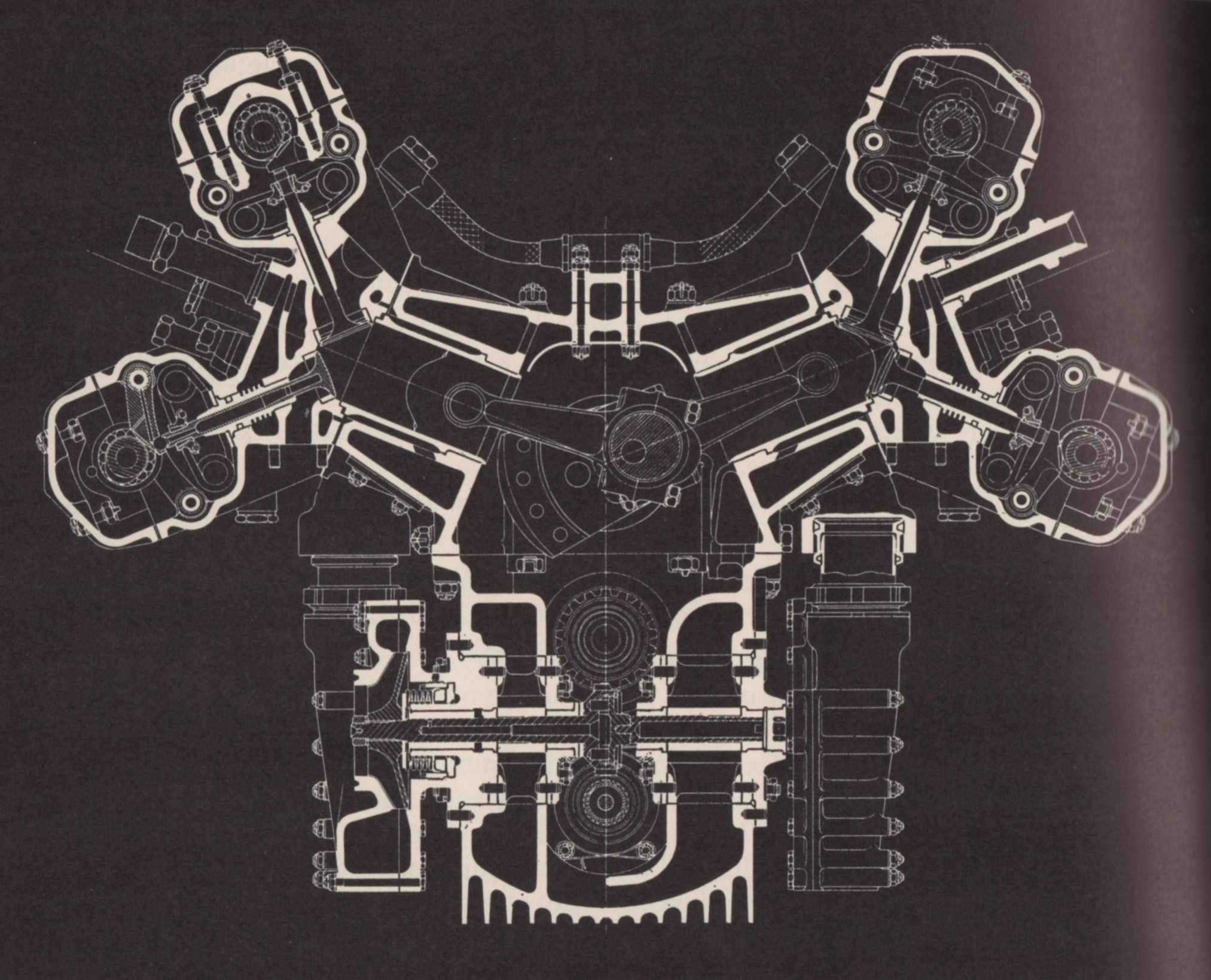 The wide-angle engine’s layout didn’t preclude complication. This and the following image from The Grand Prix Car.