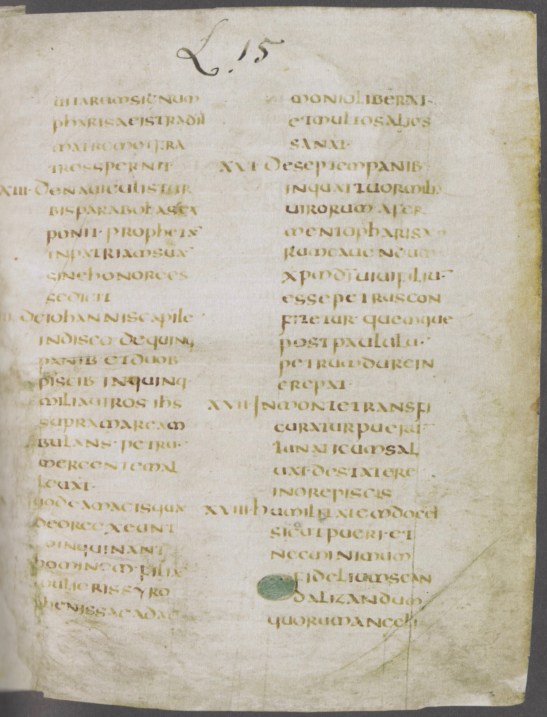 A Manuscript to Enlighten. The four gospels of Matthew, Mark, Luke, and John are presented in two-column format, with first lines longer than the rest of the passage. It’s what palaeographers call per cola et commata, loosely “by clauses and pauses.” “Each unit,” De Hamel says, “is probably what a person would read and speak aloud in a single breath…. which comes from a time of oral culture when most of the audience for the Scriptures was illiterate.”
