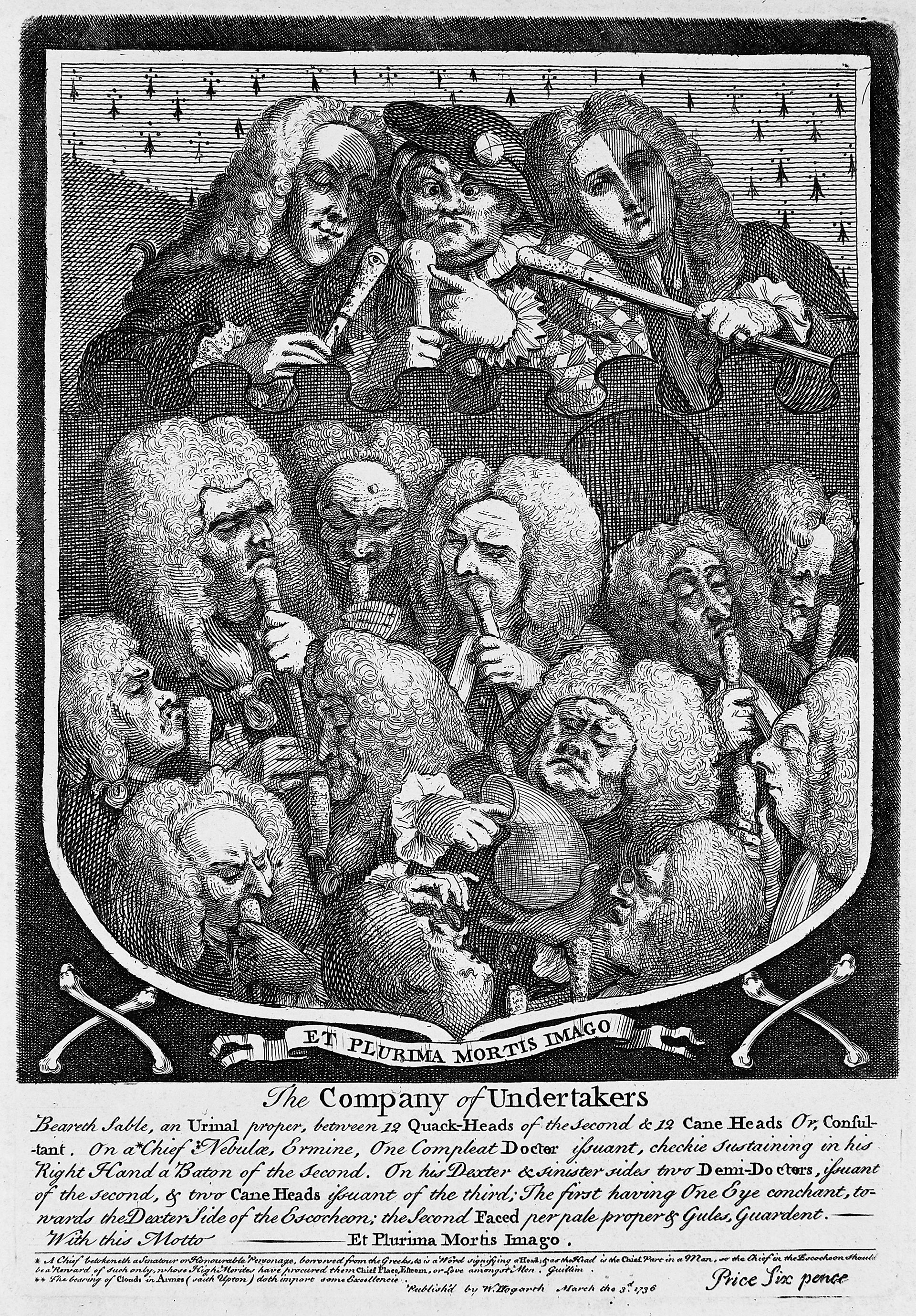 Chevalier John Taylor, upper left, English eye surgeon and medical charlatan, as depicted in William Hogarth’s The Company of Undertakers, 1736. The Latin translates “And Many an Image of Death.” Samuel Johnson said of Chevalier John Taylor, “an instance of how far impudence may carry ignorance.”
