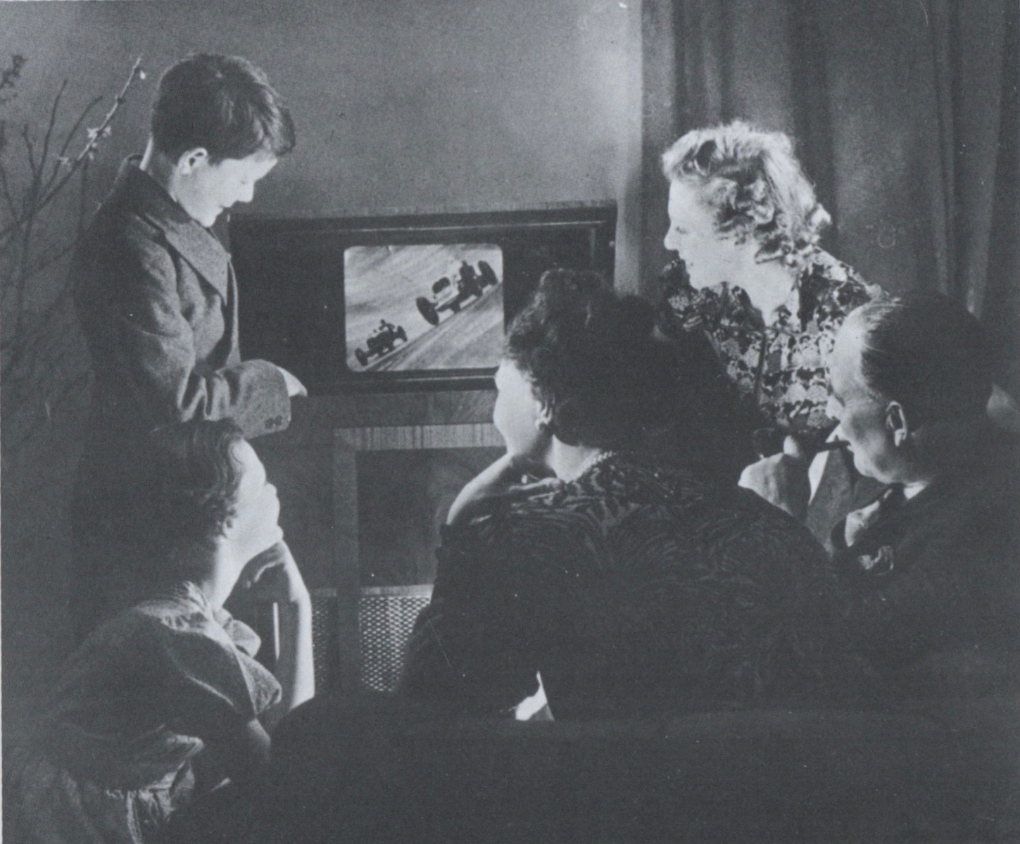 The earliest TV sets had vertical picture tubes with reflected images via mirrors. The family below watches what appears to be the Napier-Railton on the Brooklands Circuit. But the image is reversed (Brooklands is actually run counterclockwise). A mirror image?