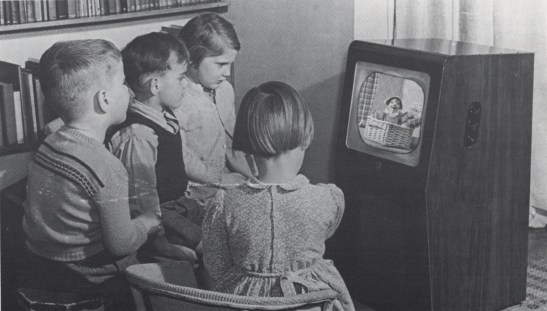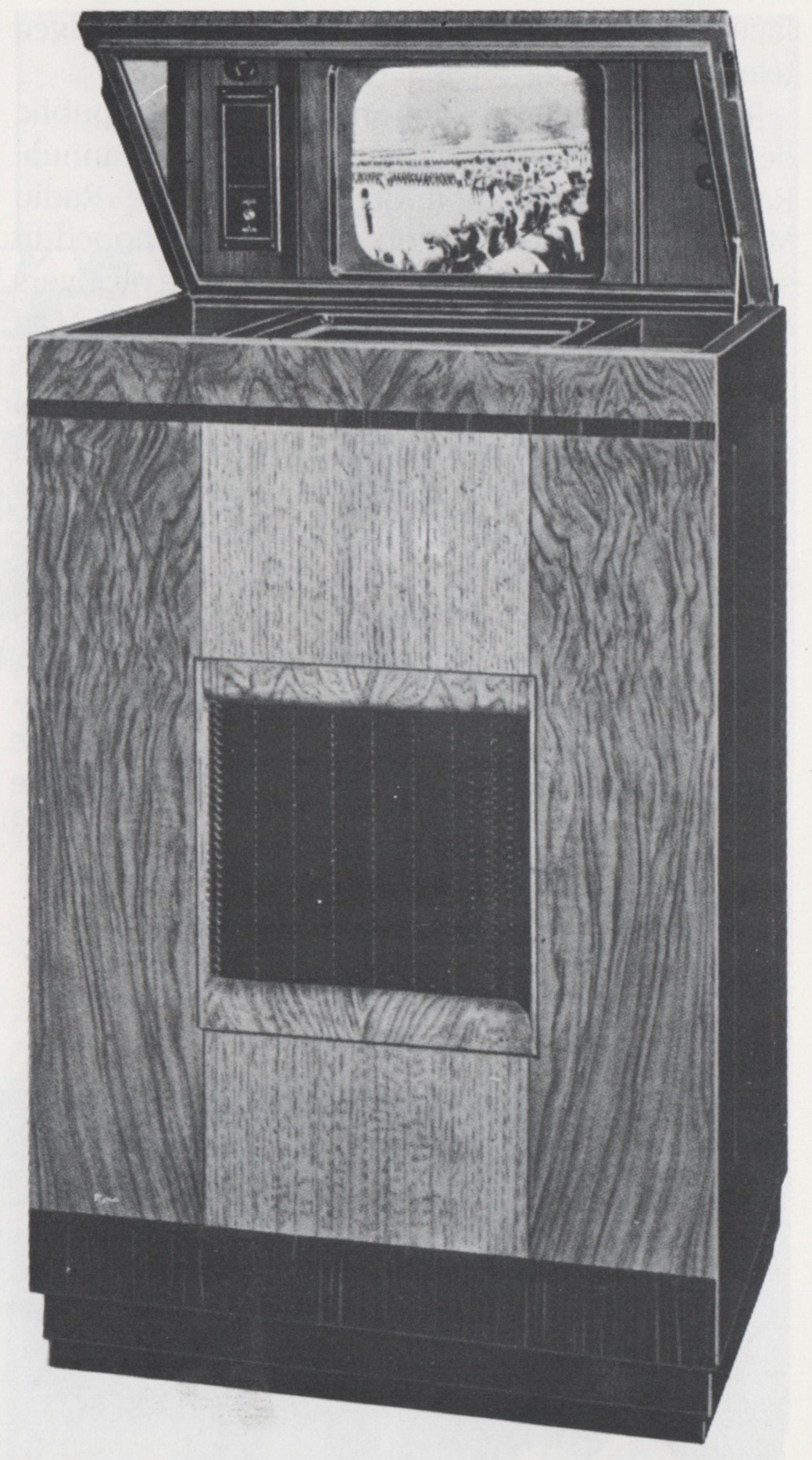 “In 1938,” BBC Television 50 Years continued, “programme hours were extended during the week and in April Sunday television started. The price of sets fell and some models with a 7 ins. by 5 1/2 ins. screen were now available at under £40 [$240 U.S. at the time, around $4350 in today’s dollar].”