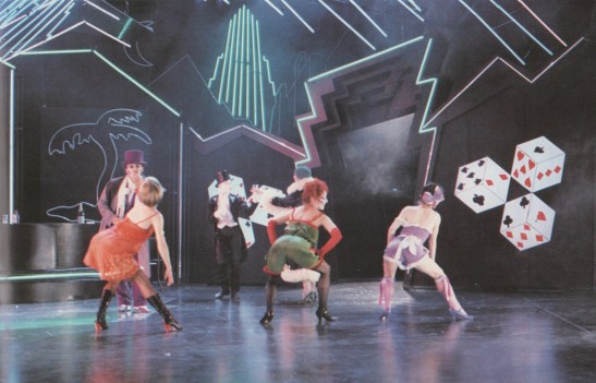 Designer Pamela Marre: “My brief was to produce a set that could change to serve two contrasting pieces…. Networks of neon lights carried the message of consumer societies for the first, and when the lights of Mahagonny disappeared, a ruined structure was left for the bleak and prophetic Requiem.” This and the following image from British Theatre Design: The Modern Age.