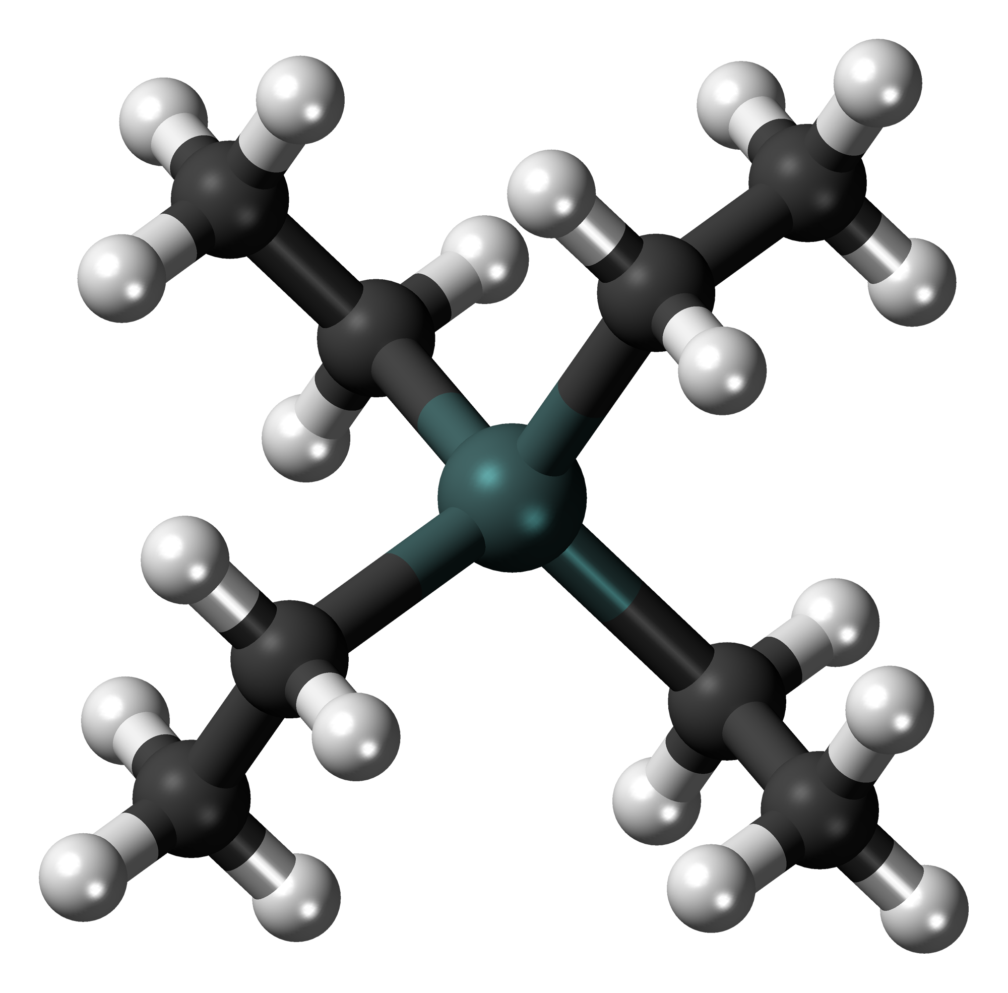 A ball-and-stick representation of TEL: Lead, Pb, is its center; the four legs are H3C, H3C, H3C, and CH3. Image by Jynto.