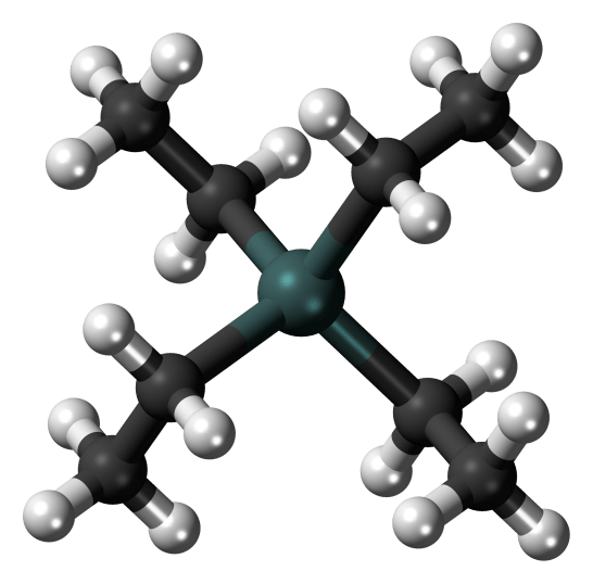 A ball-and-stick representation of TEL: Lead, Pb, is its center; the four legs are H3C, H3C, H3C, and CH3. Image by Jynto.