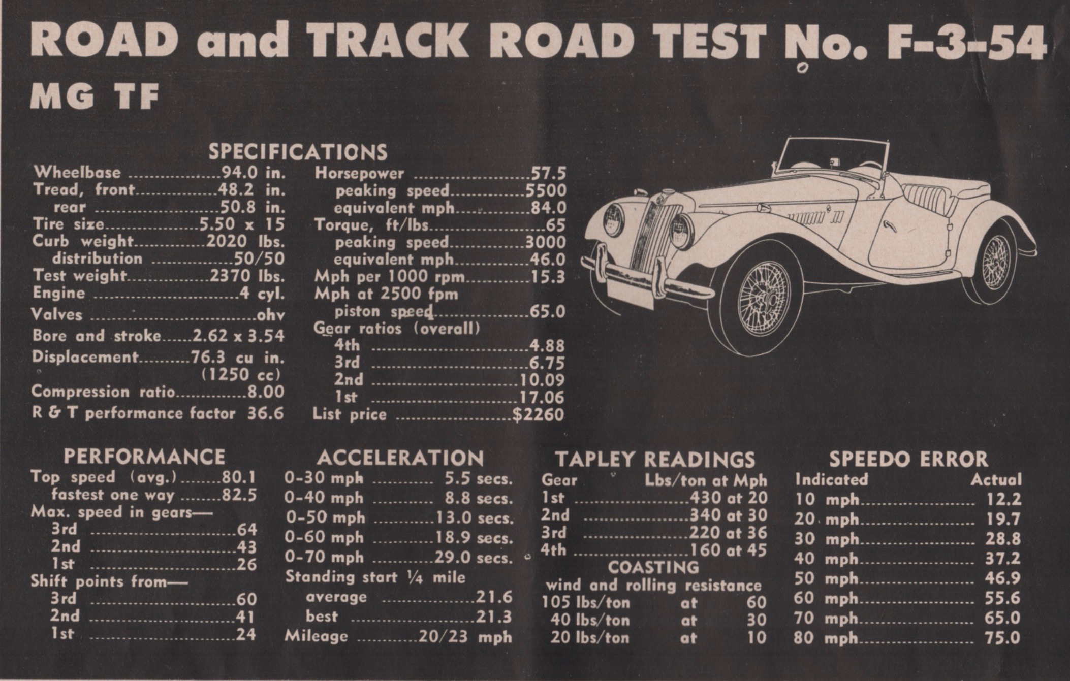 “EVERY TIME WE drive an MG,” R&T wrote in March 1954, “whether it be the TC, the TD, or as in this case, the new TF, the thought comes to mind—here is a car that exemplifies far better than mere words the answer to the question: ‘What is a sports car?’ ”