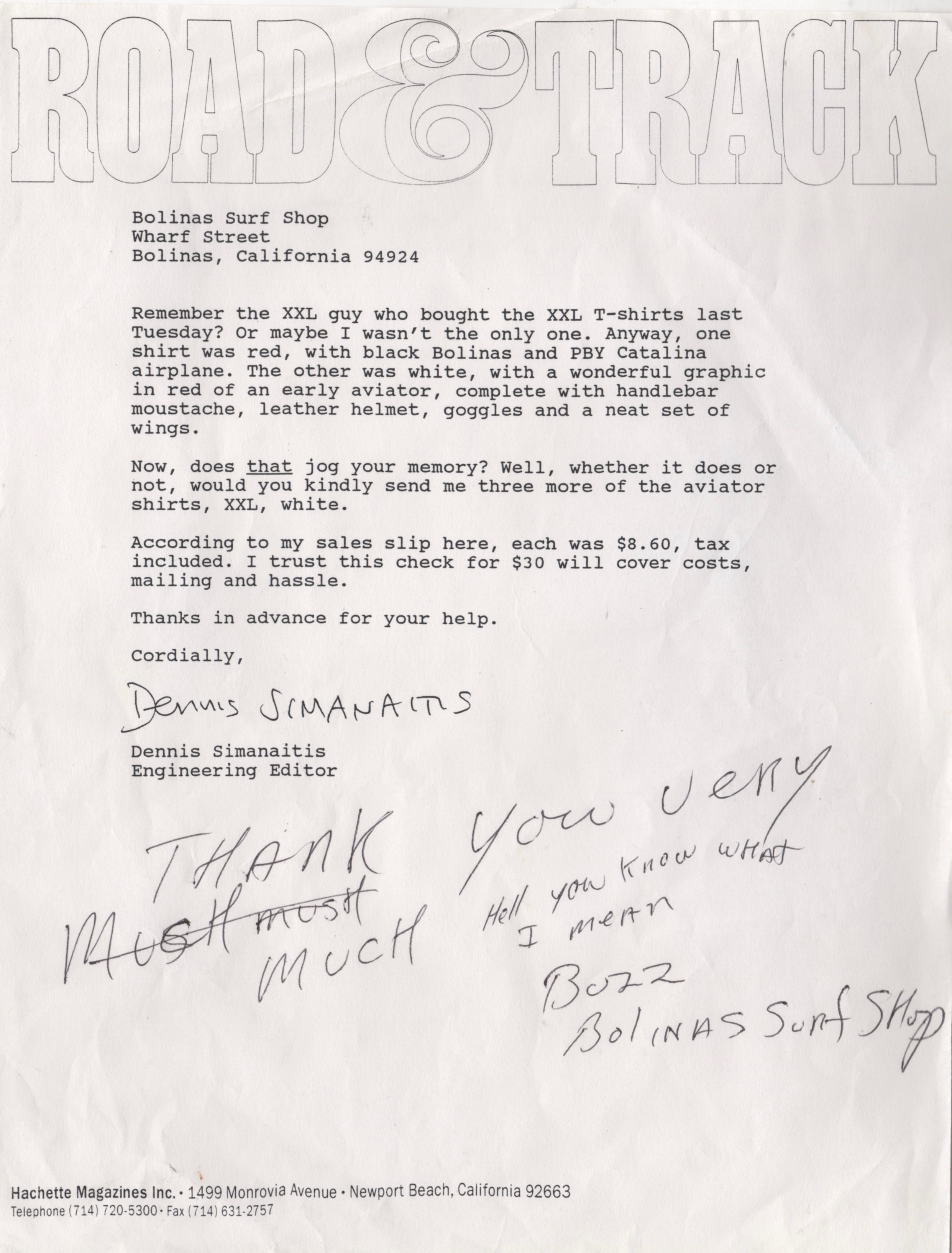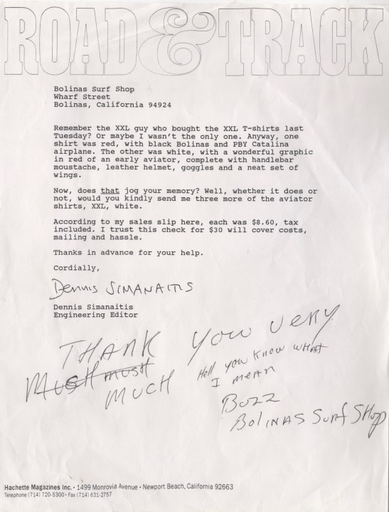 Years ago we visited Bolinas on an R&T comparison test, and I celebrated by buying T-shirts at the Bolinas Surf Shop. Uncovered in my recent sorting was the following correspondence.