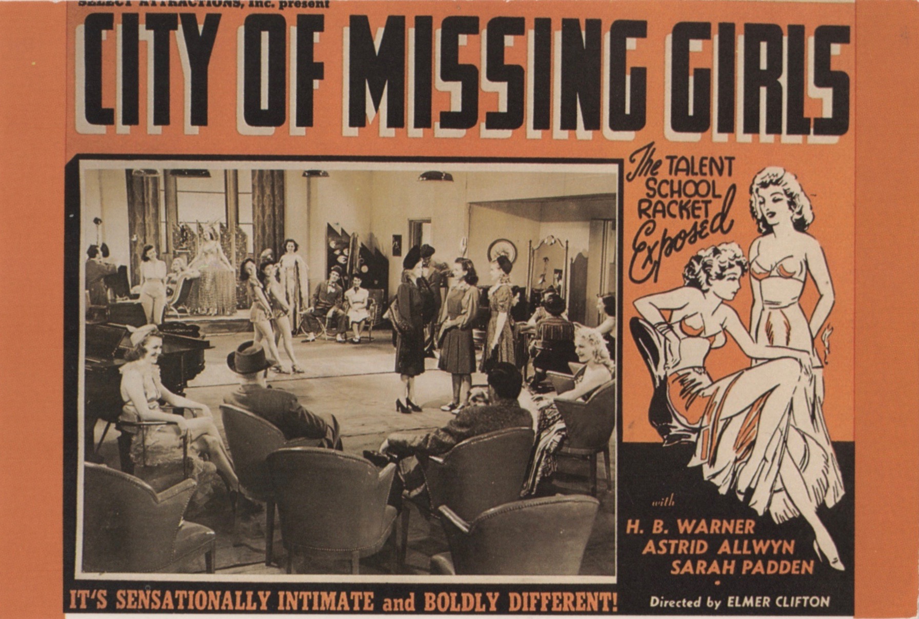 On the other hand, here’s a 1941 flick yet unviewed, as described in a postcard picked up for one reason or another. If we really wanted to watch City of Missing Girls, we could: See IMDb.