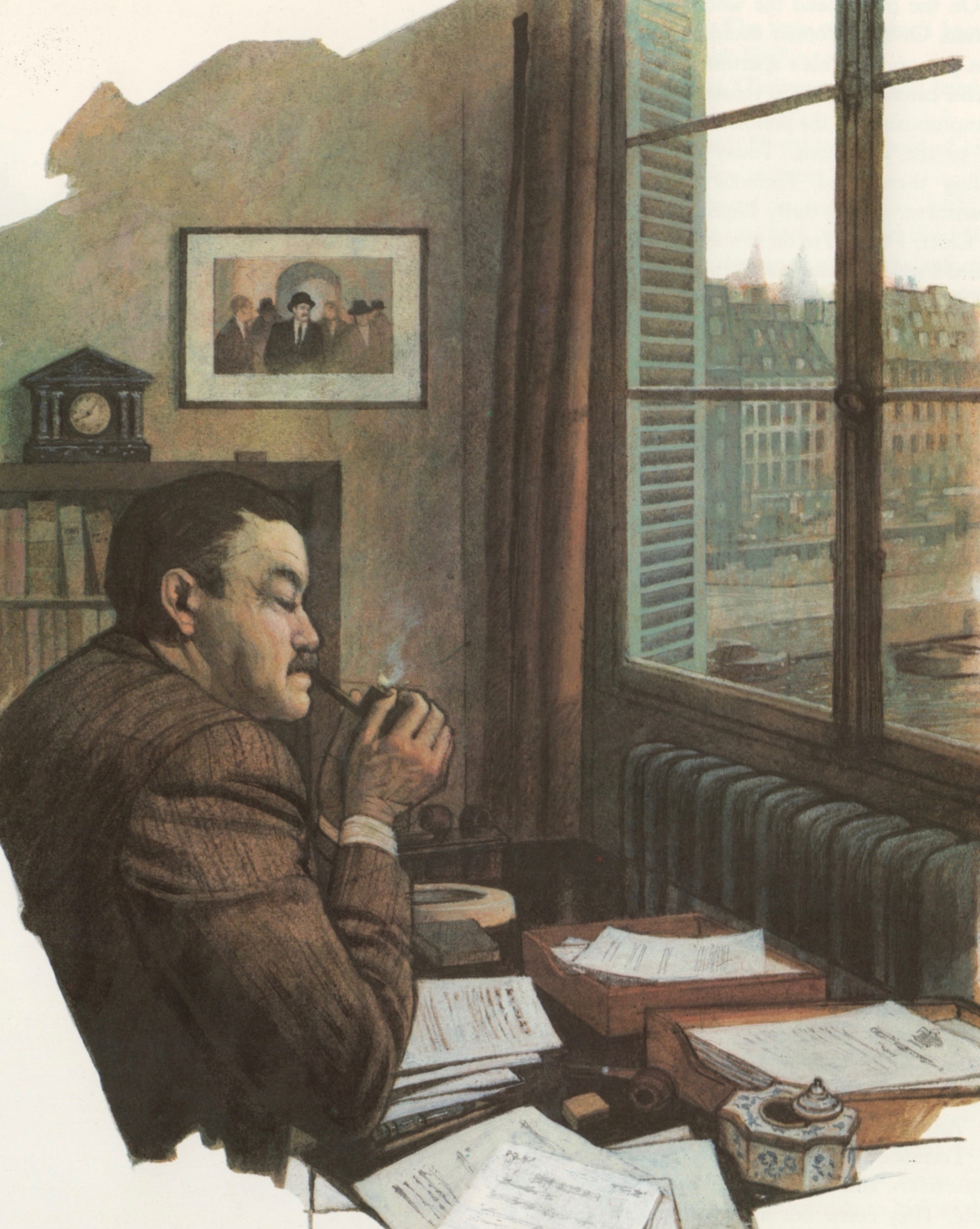 Maigret sits in his Paris office, “a proper room for a Superintendent,” notes Symons, “with its bookcase-cupboard on one wall, a desk twice the size of his old one, and the impressive-looking safe by Monard, in which he kept a bottle of Calvados for a cold day.” Illustration by Tom Adams from Great Detectives.