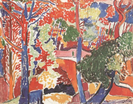Derain, Georges Braque and others also frequented L’Estaque, which, Freeman notes, “faced the port of Marseille and had its own slightly dilapidated harbor…. Derain’s paintings from L’Estaque are monumental… a radically new form of landscape with little semblance of naturalistic color.”