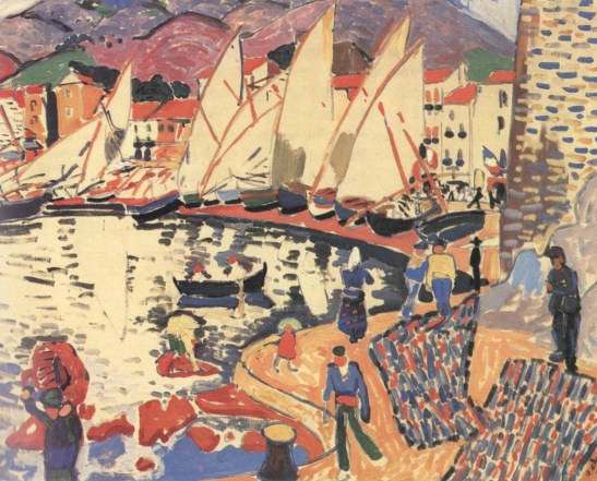 The South of France, Colors Gone Wild. One of the essays in The Fauve Landscape is James D. Herbert’s “Painters and Tourists: Matisse and Derain on the Mediterranean Shore.” He writes, “Henri Matisse summered at Saint-Tropez on the Riviera in 1904 and in Collioure, near the Spanish border, in 1905. His younger colleague André Derain joined him at Collioure in 1905. As they depicted these sites, Matisse and Derain developed many of the distinctive painting techniques and treatments of theme that were to become hallmarks of the Fauve movement.”