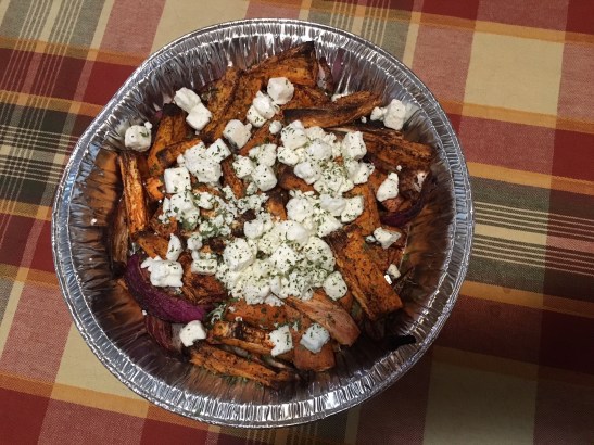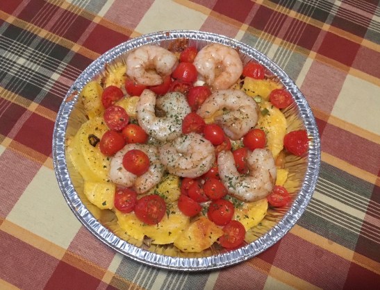 Above, our Roasted Sweet Potatoes with Feta & Spring Onions; my peanuts were added later. Below, our Baked Polenta (Trader Joe’s) with Prawns.