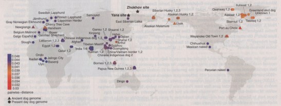 One example of Zhokhov’s relative kinship: Color scale indicates genetic distance between Zhokhov and each sample. Circles and triangles represent modern and ancient dogs, respectively. Image from Science, June 26, 2020.