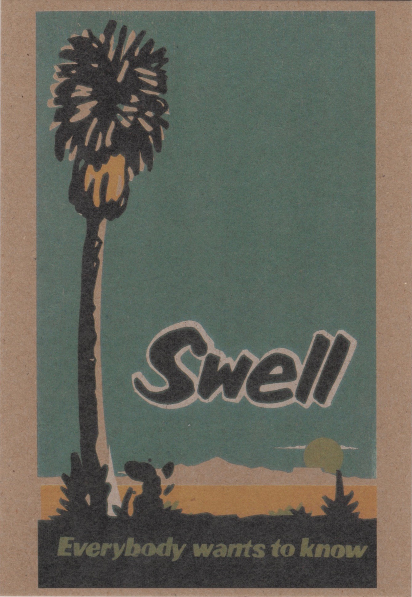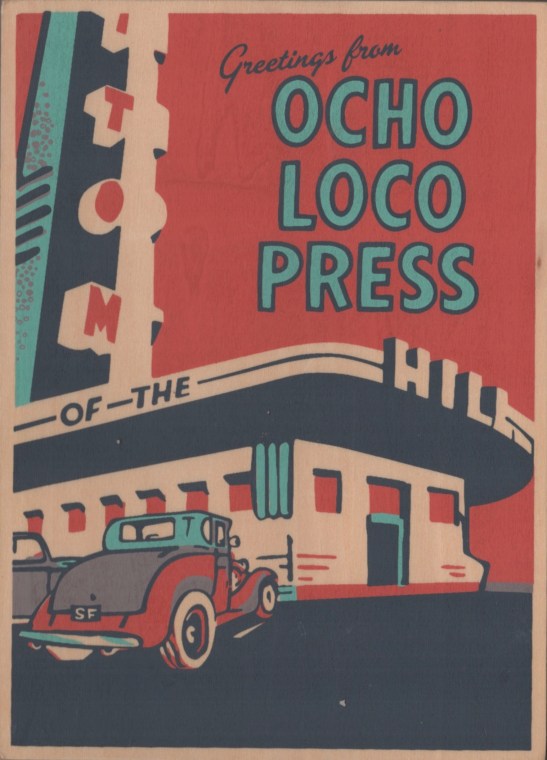 His “Greetings from Ocho Loco Press” collection listed at Amazon also cites “Inspired by the calendars and posters displayed in diners, barbershops, and gas stations during the 1950s, this postcard box features retro-themed artwork of Ocho Loco Press. Once the postcards are gone, you can hang the silk-screened box lid as a decoration.”