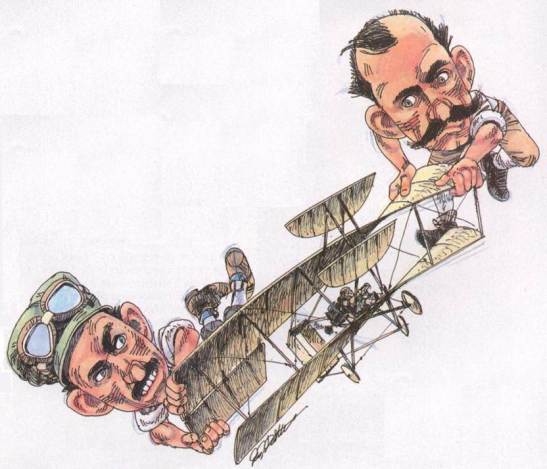 At issue was the Wrights’ wing warping versus Curtiss’s ailerons. Illustration by Jon Dahlstrom in R&T, December 2003.