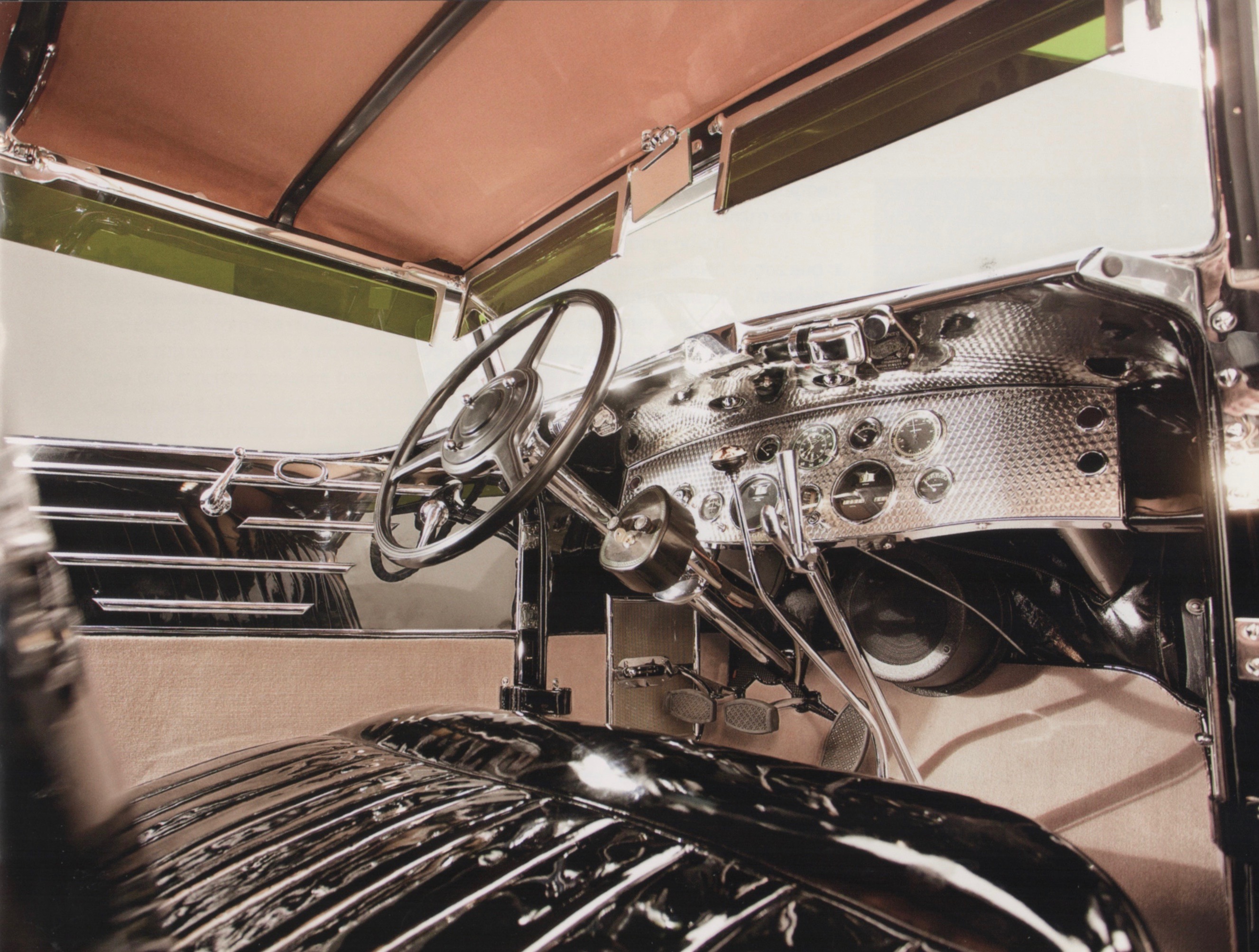 Brynan notes that The Captain ordered his Duesenberg “with a number of unusual features, including a second taillamp, an exhaust cutout, and an exceedingly rare freewheeling device.” Specified as well was an intimate two-seat layout with raked windshield and a brushed aluminum top.