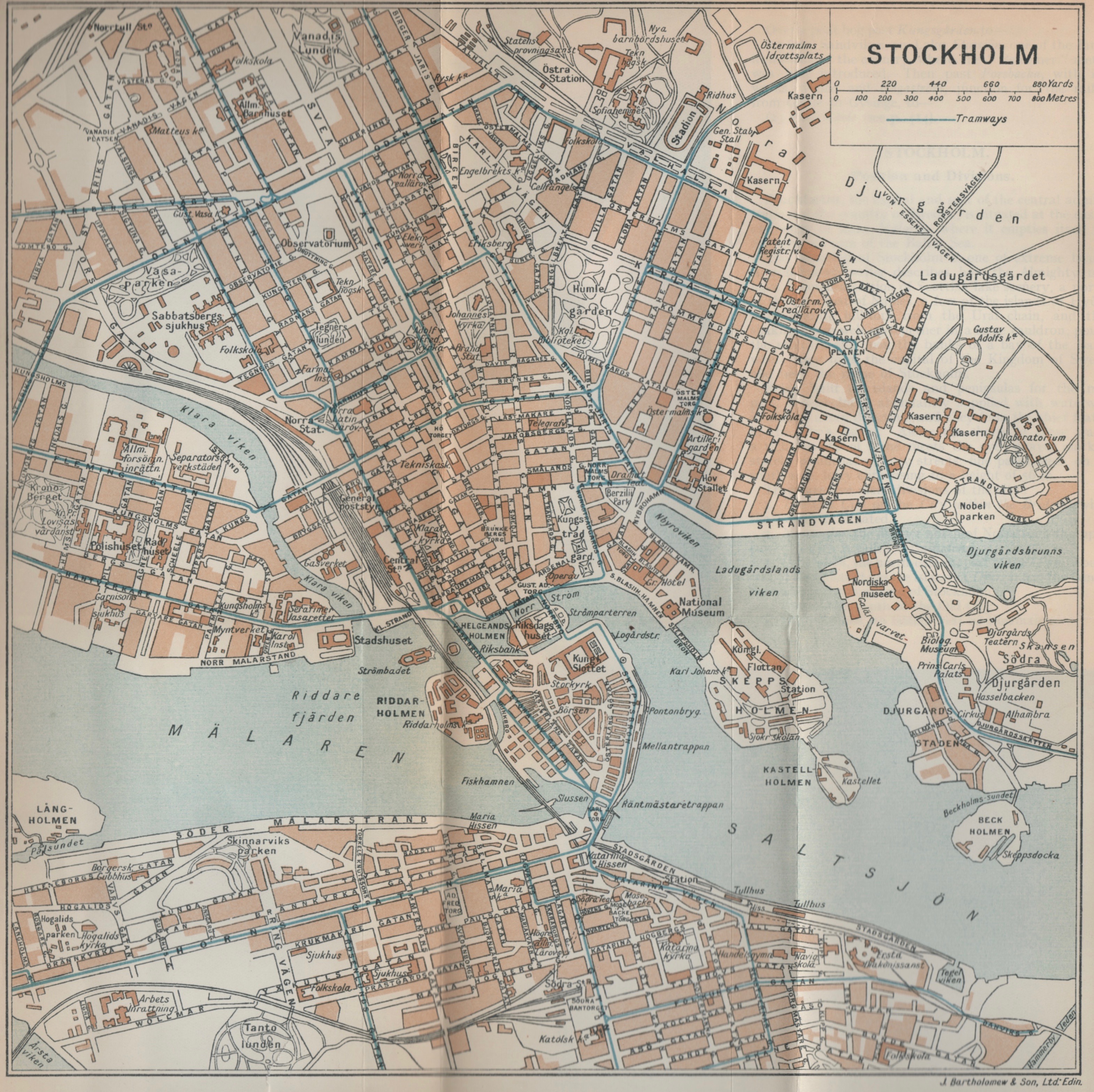 “At the beginning of the nineteenth century,” Cook’s writes, “Stockholm had 75,000 inhabitants, and in the middle of that century the first hundred thousand was reached. Since then the increase has been very rapid, and at the present day [1923] Stockholm possesses about 420,000 inhabitants.”