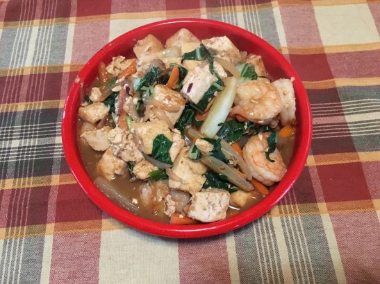 The Stir Frying. I use a wok, but a large non-stick skillet is fine. The order of stir frying is tofu, veggies, shrimp and tofu, sauce, bok choy leaves and green onions. Each step takes only a few minutes, so it’s good to have these set-asides handy.