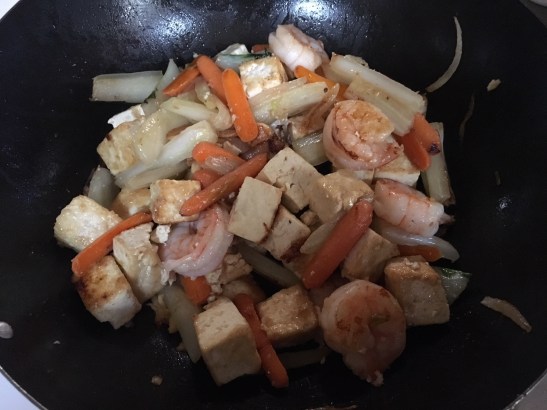 Then add the tofu and shrimp (tails removed for easier eating). Stir fry, again with gentleness so as not to mash the tofu. Continue this until the shrimp turns opaque.
