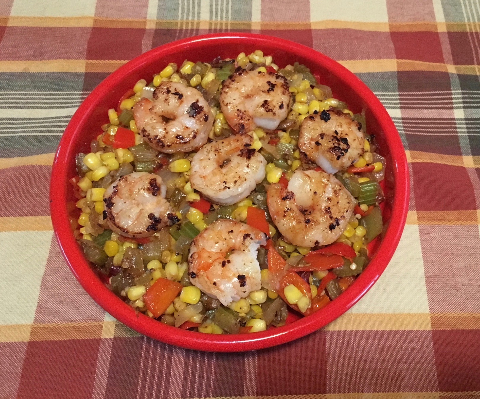 Gabrielle goes on to describe how an approaching-its-shelf-life red bell pepper and several cooked corn-on-the-cobs led to her Maque Choux. Upon consulting other Internet variations, my Maque Choux tones down on hot peppers, cheats with frozen corn, and is topped with shrimp.