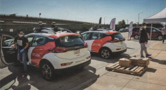 Above, Cruise has used its self-driving cars to make more than 50,000 grocery and meal deliveries from San Francisco food banks, Below, in Jacksonville, Florida, a fully autonomous Beep shuttle is used to transport Covid-19 tests between a drive-through testing site and a nearby Mayo Clinic laboratory. Images from Automotive News, July 27, 2020.