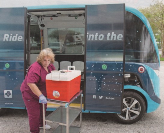 Above, Cruise has used its self-driving cars to make more than 50,000 grocery and meal deliveries from San Francisco food banks, Below, in Jacksonville, Florida, a fully autonomous Beep shuttle is used to transport Covid-19 tests between a drive-through testing site and a nearby Mayo Clinic laboratory. Images from Automotive News, July 27, 2020.