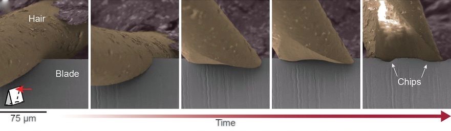 Studying It All. The researchers “carried out interrupted tests and in situ electron microscopy cutting experiments with two micromechanical testing setups.” Their investigations revealed that the blade’s variation in martensite structure played an important part in a mixed-mode cracking phenomenon leading to appreciable wear.